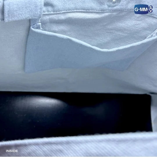A denim tote featuring fandom characters printed in a stylish patchwork design on both sides, giving it a handmade feel. This unique design tote comes with a magnetic button and an inner pocket for everyday essentials, making it practical, portable, and perfectly sized to carry everything you need in one bag!