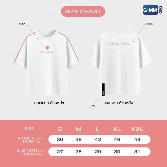 White t-shirt with old rose stripes on both sleeves featuring a FELIZZ logo in Flex Rose Gold on the front. The back features a printed FELIZZ logo overlaid with the artists' autographs decorated with shimmering silver flex. The RISER CONCERT : THE FIRST RISE tag at the hem adds a cool finishing touch. Made from Cotton Nano Plus fabric for a soft and comfortable feel with great breathability, perfect for everyday wear. Special bonus! a postcard of FELIZZ, 5 x 7 cm.