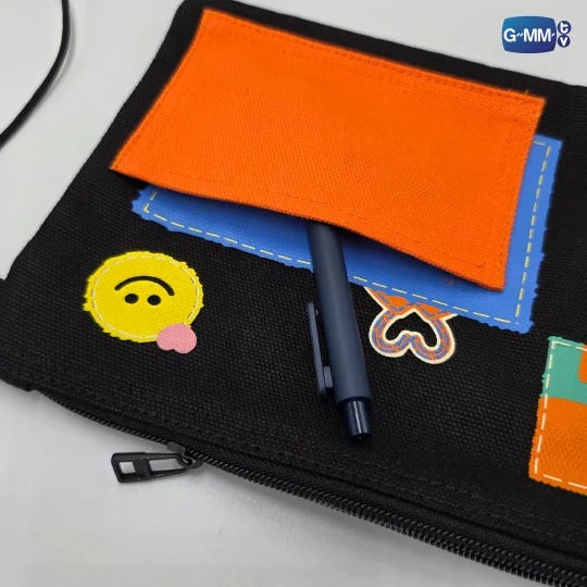 A fun, vibrant printed bag with an orange canvas pouch for storage.