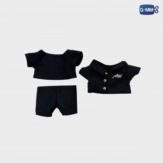 Nani 15 cm plush doll in a black t-shirt, an outer black shirt with Nani’s logo embroidered on the right chest, and black pants—'nani' name embroidered on the back, soft and cuddly.
