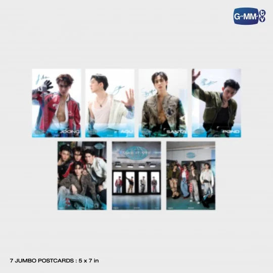 - Jumbo Postcard: Set of 7, 5 x 7”, premium art card paper with a matte lamination finish, featuring a special foil stamping technique with the autographs of all four members.